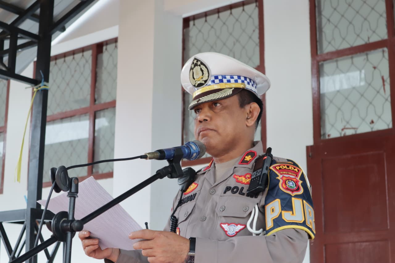 GLOBAL SULTRA.COM.Kendari, Sultra – Kasat PJR Ditlantas Polda Sulawesi Tenggara, Kompol Tiswan, S.H., M.H., bertindak sebagai Inspektur Upacara (Irup) pada pelaksanaan upacara bendera di SMKN 2 Kendari, Senin (8/9/2025).