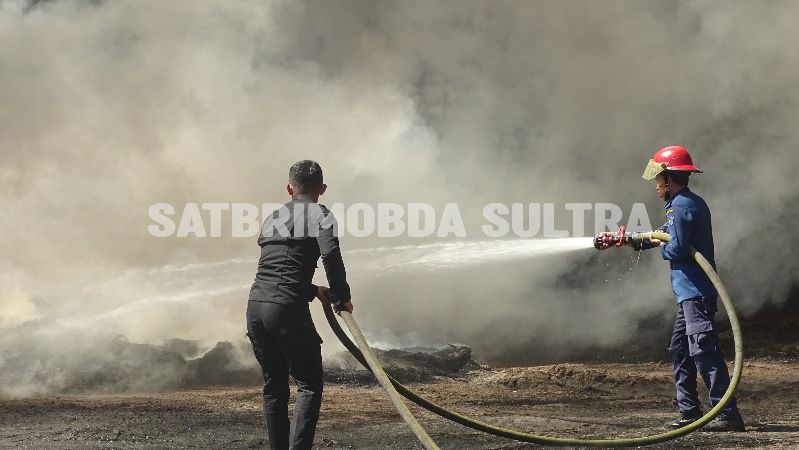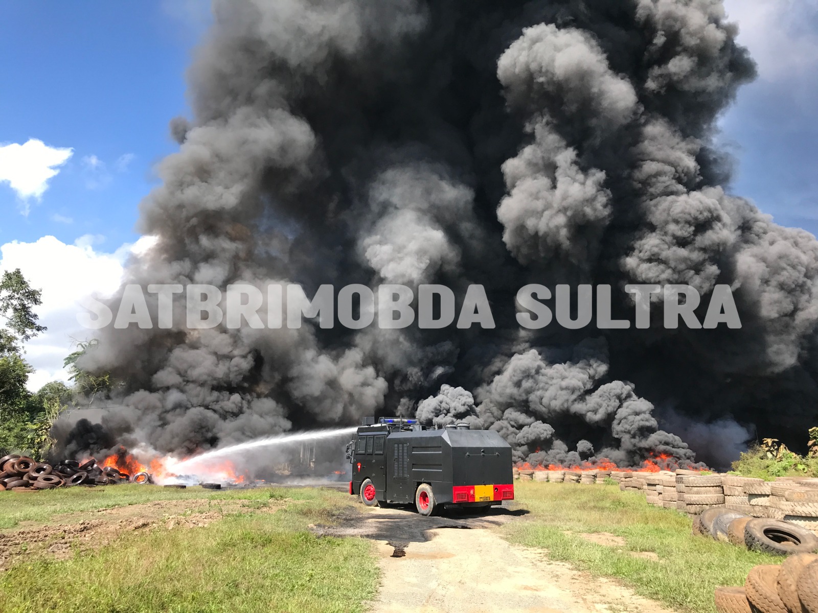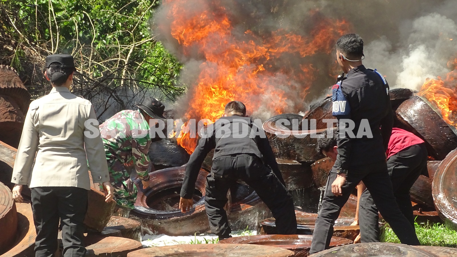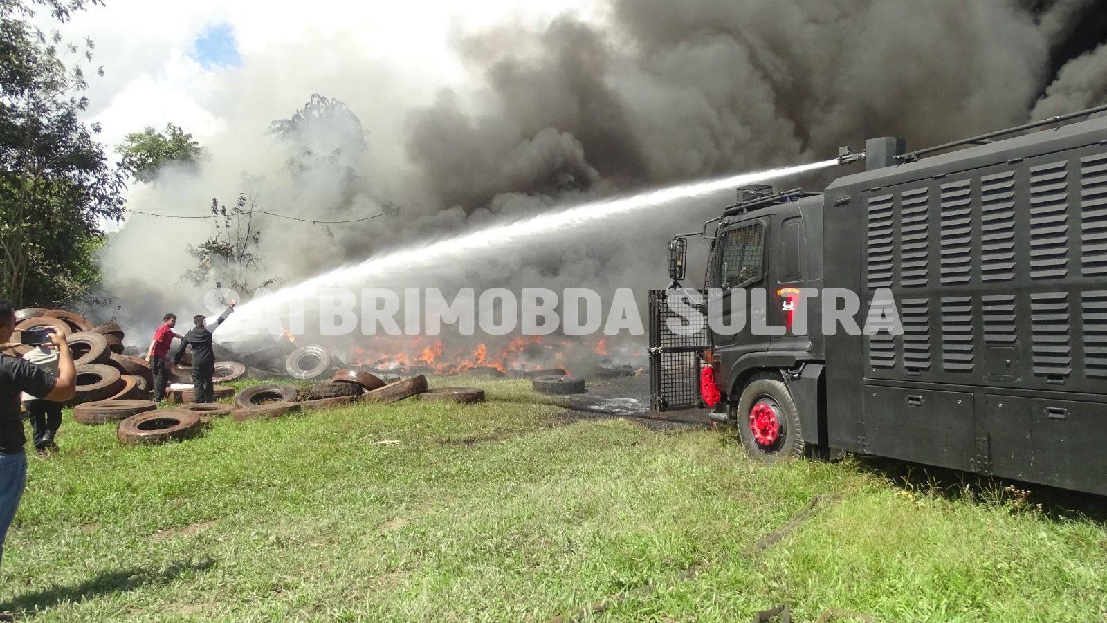 Dalam operasi pemadaman, Brimob bersama Dinas Pemadam Kebakaran Kota Kendari, Damkar Kabupaten Konawe Selatan, serta komunitas pemilik mobil tangki air bekerja sama memadamkan kobaran api yang membakar ribuan ban bekas di lahan seluas sekitar 2,5 hektare.