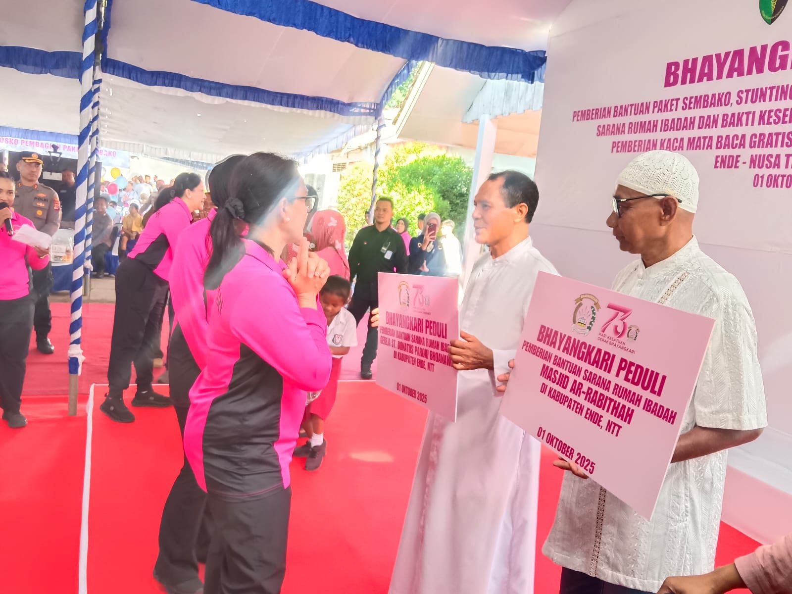 GLOBAL SULTRA.COM.Ende, NTT – Ketua Umum Bhayangkari, Ny. Julianti Sigit Prabowo, melaksanakan rangkaian kegiatan Bhayangkari Peduli di Kabupaten Ende, Nusa Tenggara Timur, Rabu (1/10/2025). Kegiatan ini meliputi penyaluran bantuan sosial, bakti kesehatan, serta bakti religi yang dipusatkan di halaman Kantor Camat Ende Utara, Kelurahan Kota Raja, Kecamatan Ende Utara.