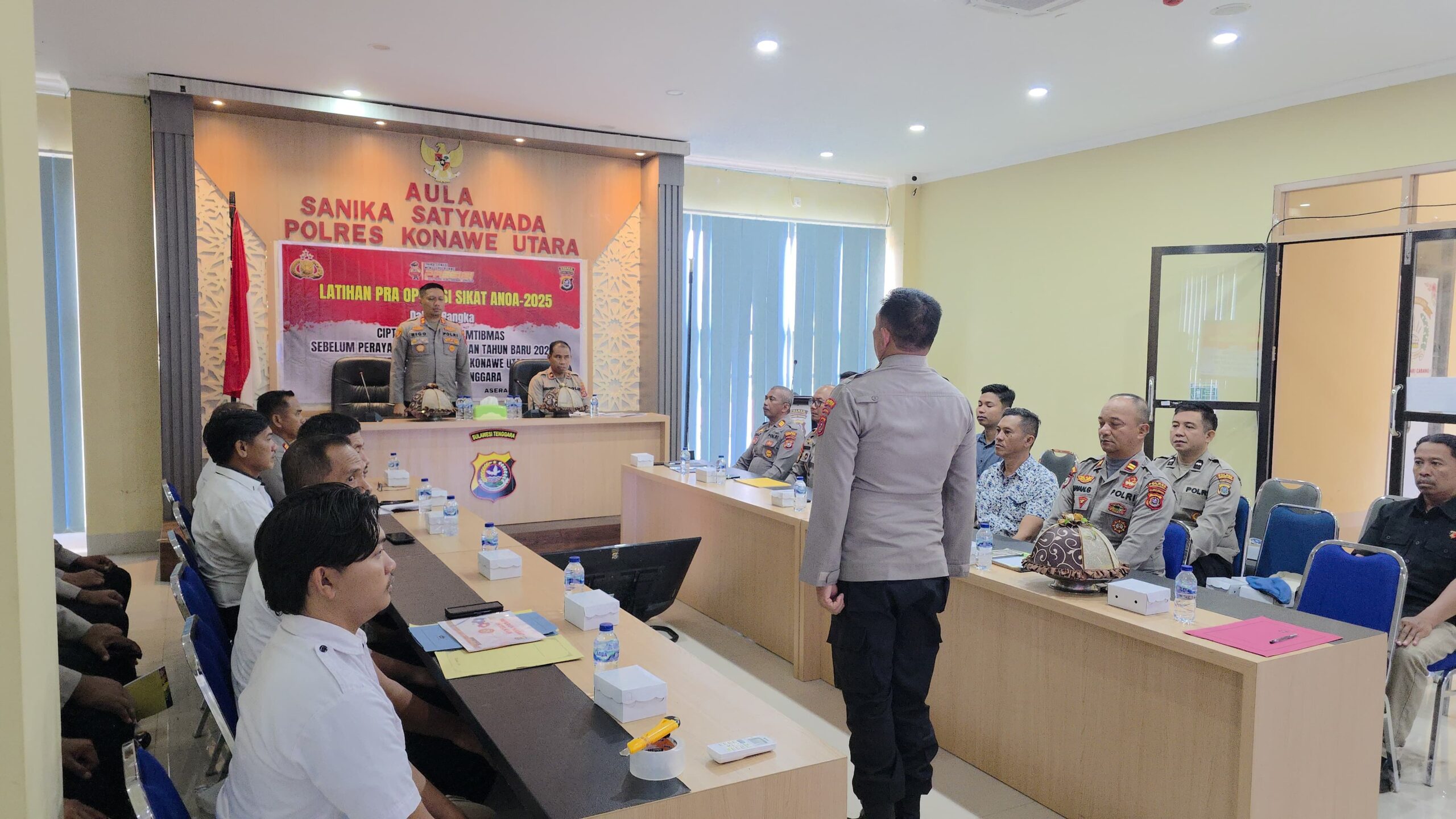 Latihan operasi Sikat 2025 bertempat di Aula Sanika Satyawada Polres Konawe utara dihadiri Wakapolres Kompol Sumarso, S.Sos, Pejabat utama (PJU) Polres Konut, perwira serta 32 orang personel yang terlibat operasi sesuai surat perintah nomor : SPRIN/746/X/OPS.1.3./2025