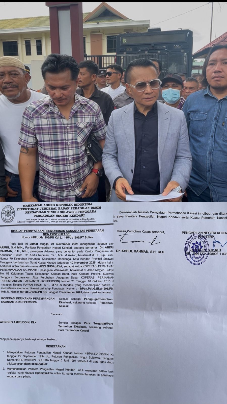 Kuasa Hukum Abdul Rahman mengatakan, bahwa penetapan Non-Executable oleh Pengadilan Negeri itu status quo atau belum berkekuatan hukum tetap. Maka permohonan kasasi tersebut telah diterima dan akan diberitahukan kepada para termohon kasasi.