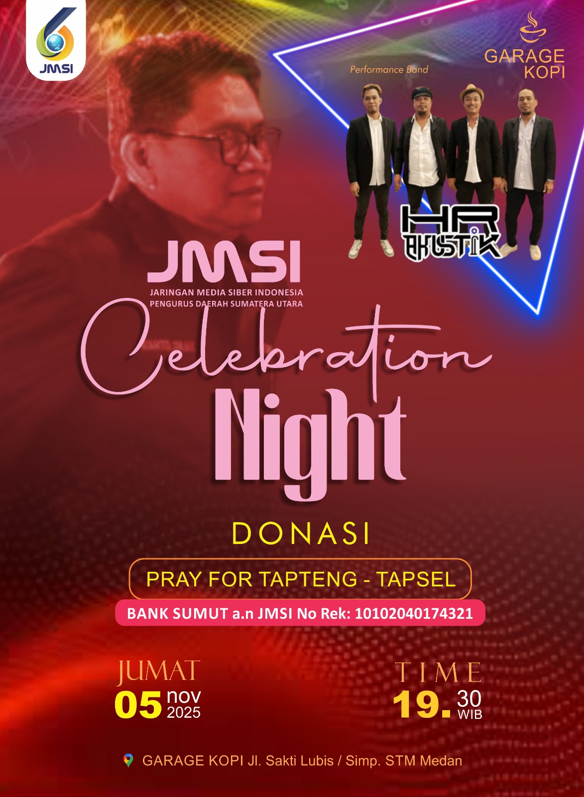 GLOBAL SULTRA.COM.MEDAN,-Jaringan Media Siber Indonesia (JMSI) Sumatera Utara menginisiasi kegiatan Pray for Bencana Sumut lewat gelaran Konser Musik HR Akustik “Celebration Night” yang akan berlangsung di Garage Kopi, Jalan STM/Simpang Sakti Lubis, pada Jumat malam Sabtu, 5 Desember 2025.