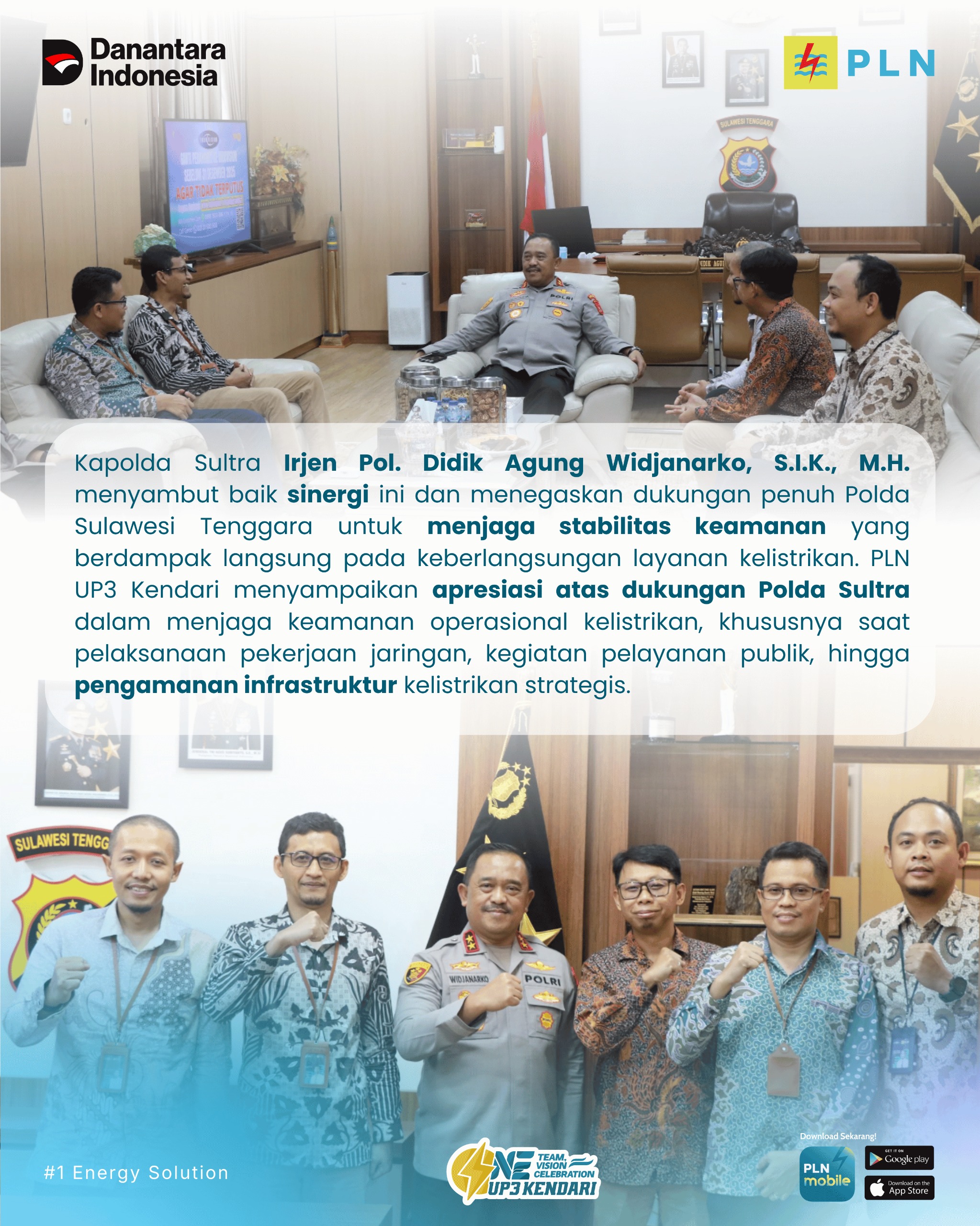 Kapolda Sultra Irjen Pol. Didik Agung Widjanarko menyambut baik sinergi ini dan menegaskan dukungan penuh Polda Sulawesi Tenggara untuk menjaga stabilitas keamanan yang berdampak langsung pada keberlangsungan layanan kelistrikan.