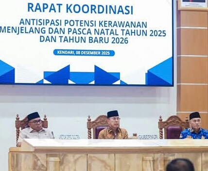 Hal ini diungkapkan Gubernur Sulawesi Tenggara, Mayjen TNI (Purn) Andi Sumangerukka, saat memimpin Rapat Koordinasi Antisipasi Potensi Kerawanan Menjelang dan Pasca Natal 2025 serta Tahun Baru 2026 (Nataru) yang berlangsung di Ruang Pola Kantor Gubernur Sulawesi Tenggara, Senin (8/12/2025).