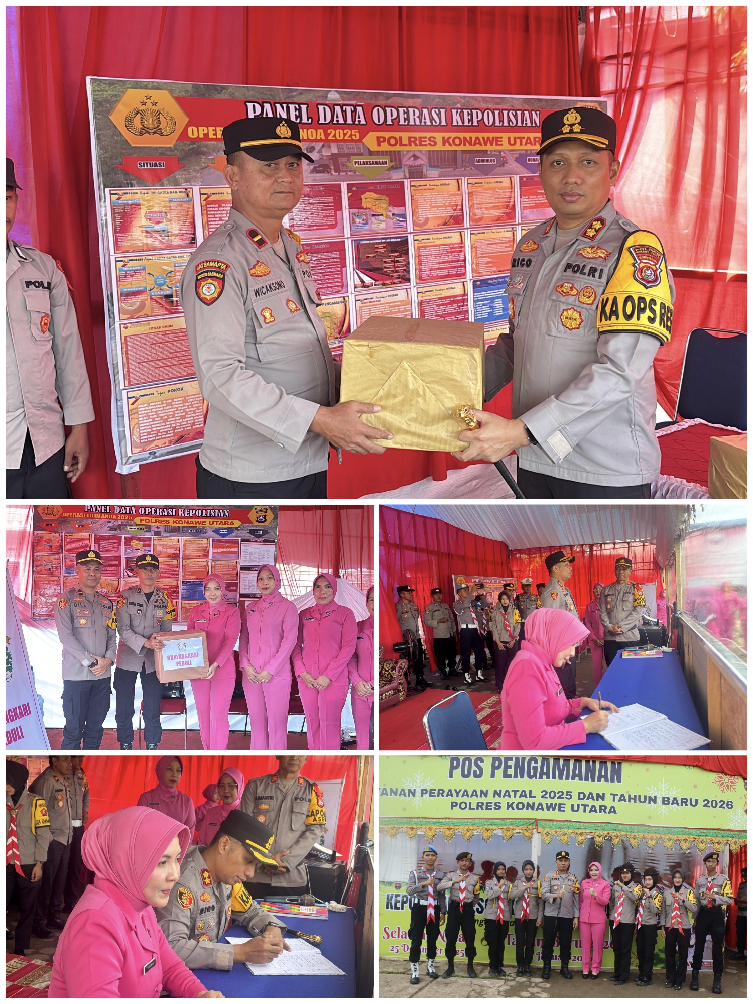 GLOBAL SULTRA.COM.Konawe Utara, — Kepala Kepolisian Resor Konawe utara AKBP Rico Fernanda, S.H., S.I.K., M.H bersama Ketua Bhayangkari cabang Ny. Esi Rico Fernanda pejabat utama serta pengurus bhayangkari melaksanakan pengecekan kondisi pos pengamanan natal dan tahun baru, selasa (30/12/25)