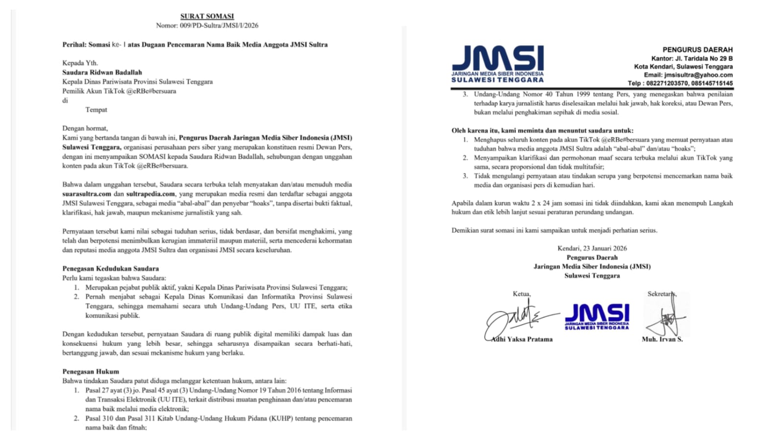 Somasi dilayangkan menyusul unggahan akun TikTok @eRBeBersuara atau Ridwan Badallah sebagai pemilik akun yang diduga mencatut serta melabeli dua media anggota JMSI Sultra, yakni Suarasultra.com dan Sultrapedia.com, sebagai media “abal-abal” dan penyebar hoaks.