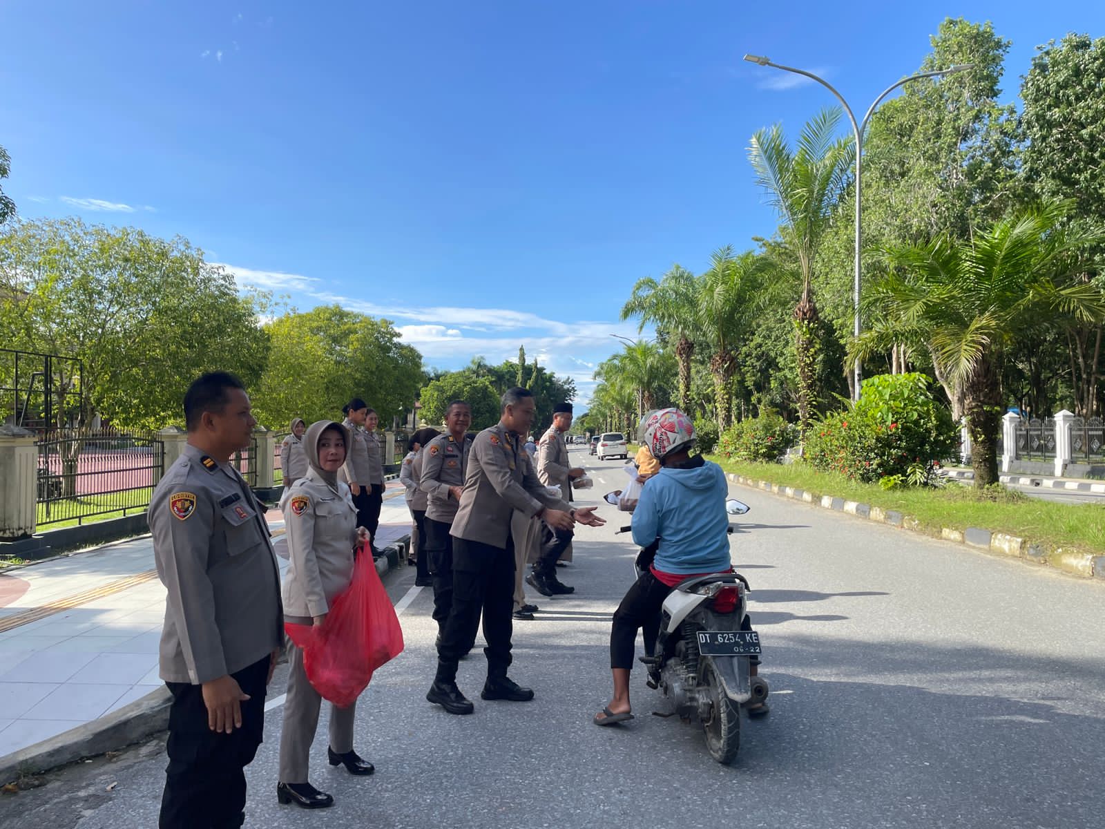 Kegiatan berbagi tersebut dipimpin langsung Kepala Biro Logistik Polda Sultra, Kombes Pol Lilik Istiyono, S.I.K., bersama sejumlah personel. Dengan penuh senyum, mereka menyapa pengendara roda dua dan roda empat yang melintas di depan Mako Polda Sultra.