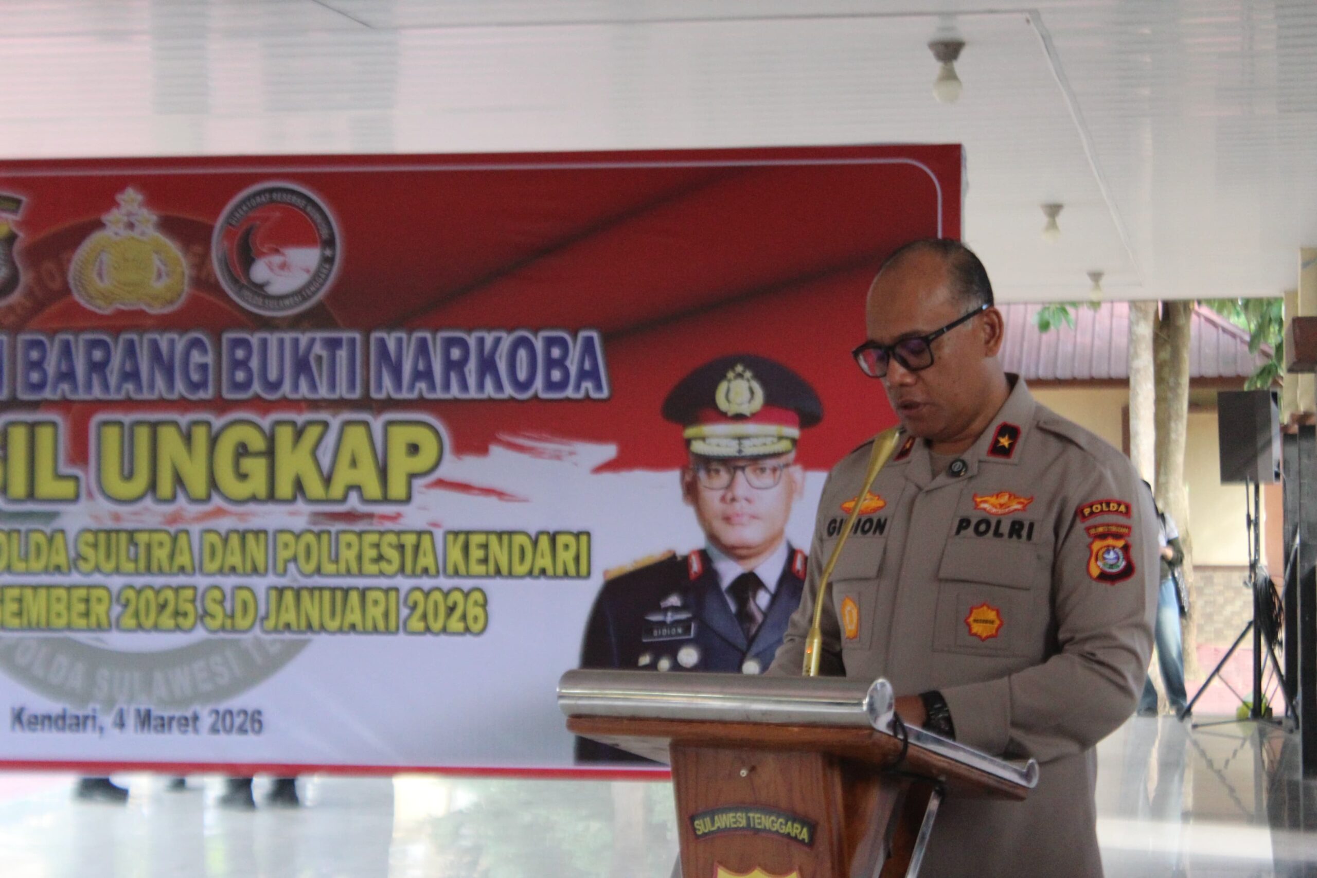 GLOBAL SULTRA.COM.Kendari,- Direktorat Reserse Narkoba Polda Sultra melaksanakan pemusnahan barang bukti narkotika hasil pengungkapan kasus periode Desember 2025 hingga Januari 2026, Rabu 4 Maret 2026. Kegiatan pemusnahan tersebut digelar di depan Tribun Presisi Polda Sultra dan dipimpin langsung oleh Wakapolda Sultra Brigjen Pol Dr. Gidion Arief Setyawan, S.H., S.I.K., M.Hum.