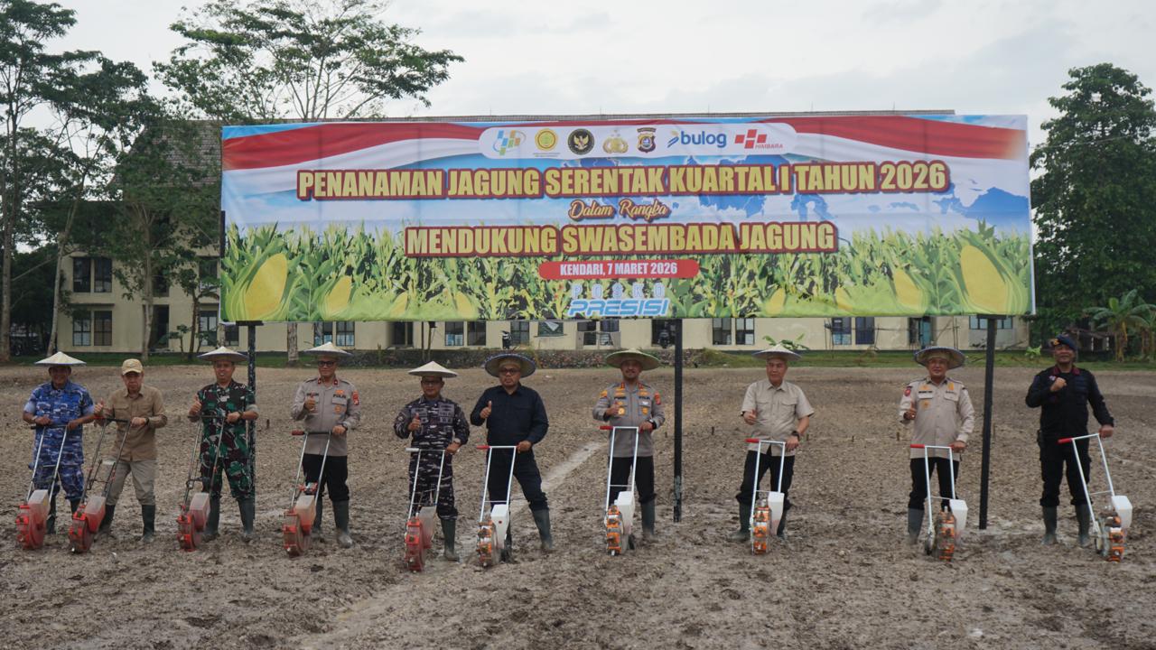 GLOBAL SULTRA.COM.KENDARI,– Polda Sulawesi Tenggara (Sultra) melaksanakan kegiatan penanaman jagung serentak Kuartal I Tahun 2026 dalam rangka mendukung program pemerintah menuju swasembada jagung nasional. Kegiatan tersebut digelar di lahan milik Brimob Polda Sultra, Sabtu (7/3/2026).