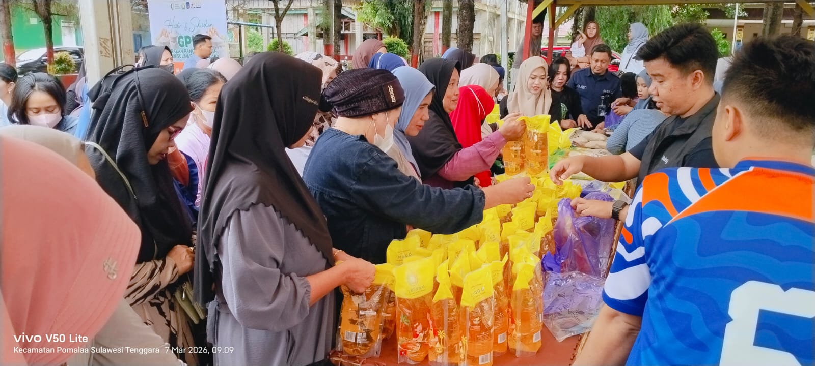 Sejak dibuka pukul 09.00 WITA, pekarangan Kantor Camat Pomalaa dipadati warga yang datang untuk membeli komoditas pangan murah yang disiapkan Kadin Sultra bersama Kadin Kolaka.