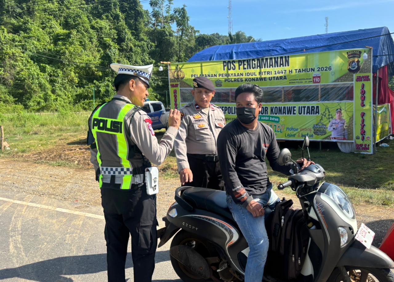 GLOBAL SULTRA.COM.Konawe Utara, – Dalam rangka mendukung kelancaran dan keamanan perayaan Idul Fitri 1447 Hijriah tahun 2026, personel Pos Pengamanan (Pos PAM) Sawa dipimpin Kapospam Ipda Mukti Lamuru melaksanakan kegiatan pengaturan (gatur) arus lalu lintas serta memberikan imbauan kamtibmas kepada para pengendara dan pemudik.
