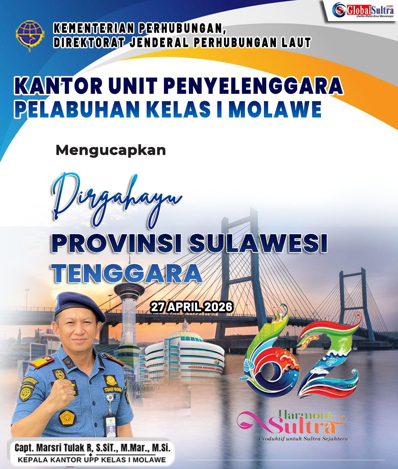 DIRGAHAYU PROVINSI SULAWESI TENGGARA KE 62Admin Redaksi25 April 2026News4 views GLOBAL SULTRA.COM.KONAWE UTARA,-Jajaran Pimpinan dan Staf Kantor Unit Penyelenggara Pelabuhan Kelas I MOLAWE Mengucapkan Dirgahayu Provinsi Sulawesi Tenggara Ke 62 CAPT.MARSI TULAK, R.S.iT, M.Mar Kepala Kantor . Berita TerkaitDIRGAHAYU PROVINSI SULAWESI TENGGARA KE 62DIRGAHAYU PROVINSI SULAWESI TENGGARA KE 62Personel Polda Sultra Laksanakan Pengamanan HUT Sultra di Kawasan Tugu Eks MTQDIRGAHAYU PROVINSI SULAWESI TENGGARA KE 62Kadispar Sultra Ridwan Badallah Tegaskan, Harmoni Sultra Bukan Hanya Hiburan, Sebagai Promosi Kreatif UMKMGubernur Sultra Resmikan Stand Pameran UMKM Pada HUT ke-62 SultraHUT Sultra ke-62 Resmi Digelar di Kendari, Gubernur ASR Sampaikan Maaf ke Masyarakat WakatobiMeriahkan HUT Sultra Ke 62, Ketua MAKN Muna, YM.La Ode Riago, Tampil Memukau Mengenakan Busana Kebesaran Raja Muna